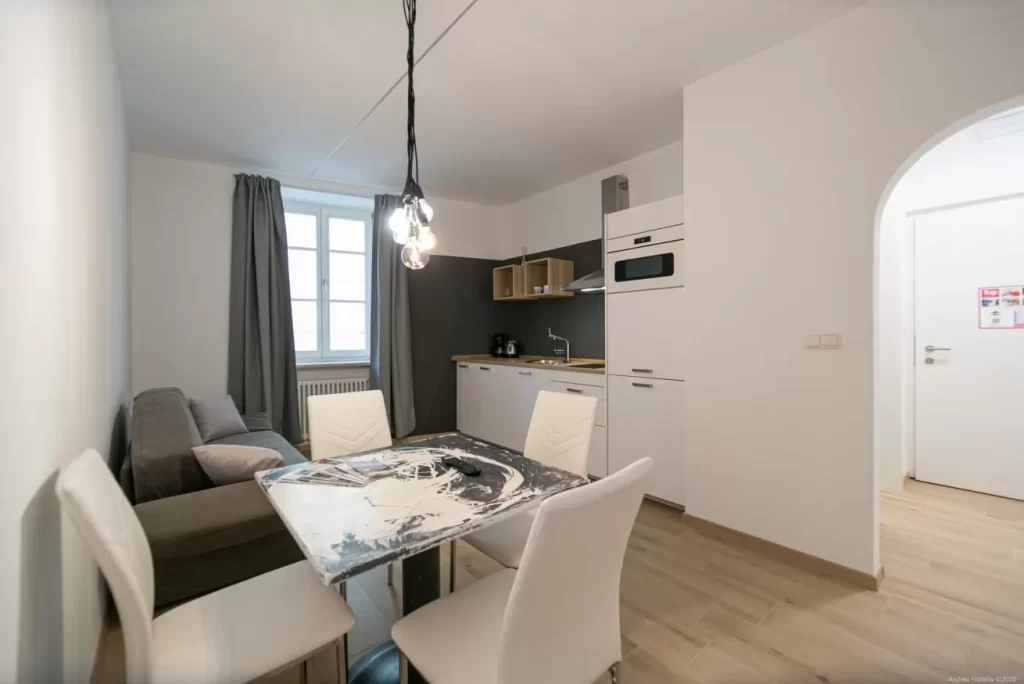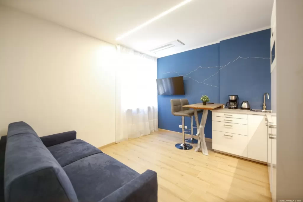 Composto da camera da letto con letto matrimoniale e soggiorno con un divano letto per 2 persone. Cucina completamente arredata con forno microonde e lavastoviglie, tavolo e sedie, bagno/WC, TV LCD con satellite, WIFI. Presente anche la sauna a infrarossi. Sono compresi asciugamani (mani e doccia) e lenzuola. Su richiesta mettiamo a disposizione un lettino senza supplemento.