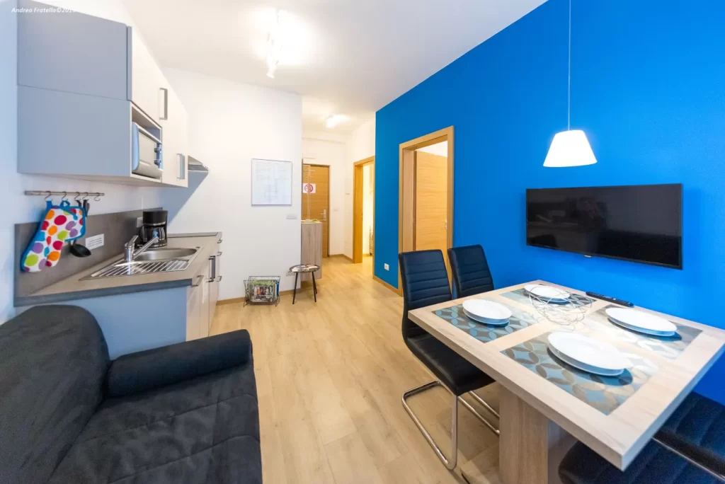 Ideale per 2 persone. 28 m². Composto da camera da letto con letto matrimoniale e soggiorno con un divano letto per 2 persone. Cucina completamente arredata con forno microonde e lavastoviglie, tavolo e sedie, bagno/WC, TV LCD con satellite, WIFI. Sono compresi asciugamani (mani e doccia) e lenzuola. Su richiesta mettiamo a disposizione un lettino senza supplemento.